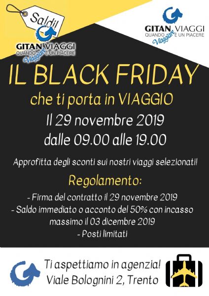 IL BLACK FRIDAY PIÙ BELLO CHE C’È …perchè ti porta in viaggio! Ti aspettiamo in agenzia per proporti le nostre offerte!