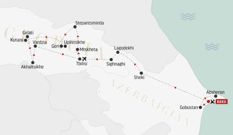 Il nostro viaggio in Azerbaijan e in Georgia è giunto alla sua conclusione ed è arrivato il momento di salutare queste affascinanti nazioni e i loro echi di un passato lontano. A seconda dell’orario di partenza, veniamo accompagnati in aeroporto in tempo utile per salire a bordo del nostro volo di linea che ci riporta in Italia.
