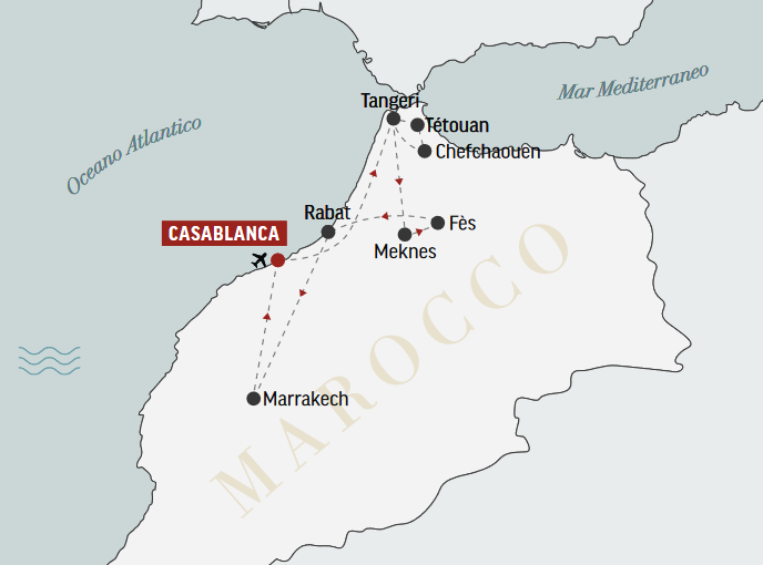 Un viaggio in Marocco che ci porta a conoscere le storiche Città Imperiali e le suggestive medine del Nord. Vedremo Rabat, il giardino di Allah, Meknès e le sue colline di uliveti, Fès, con la sua incredibile medina, Marrakech, coi suoi giardini e la sua vivacità, ma anche Tetouan, incastonata ai piedi dei Rif, e la celeberrima Chefchaouen, la città blu. Meravigliose perle marocchine custodite fra il mare intenso, l’arido deserto e la catena montuosa dell’Atlante.