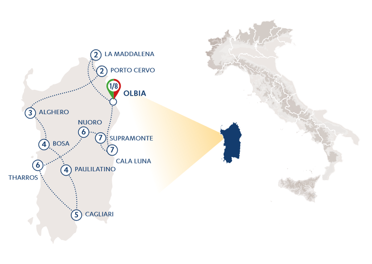 Olbia – Arcipelago della Maddalena – Costa Smeralda – Santu Antine – Saccargia – Alghero – Bosa – Paulilatino – Cagliari – Tharros – Nuoro – Cala Luna – Supramonte
