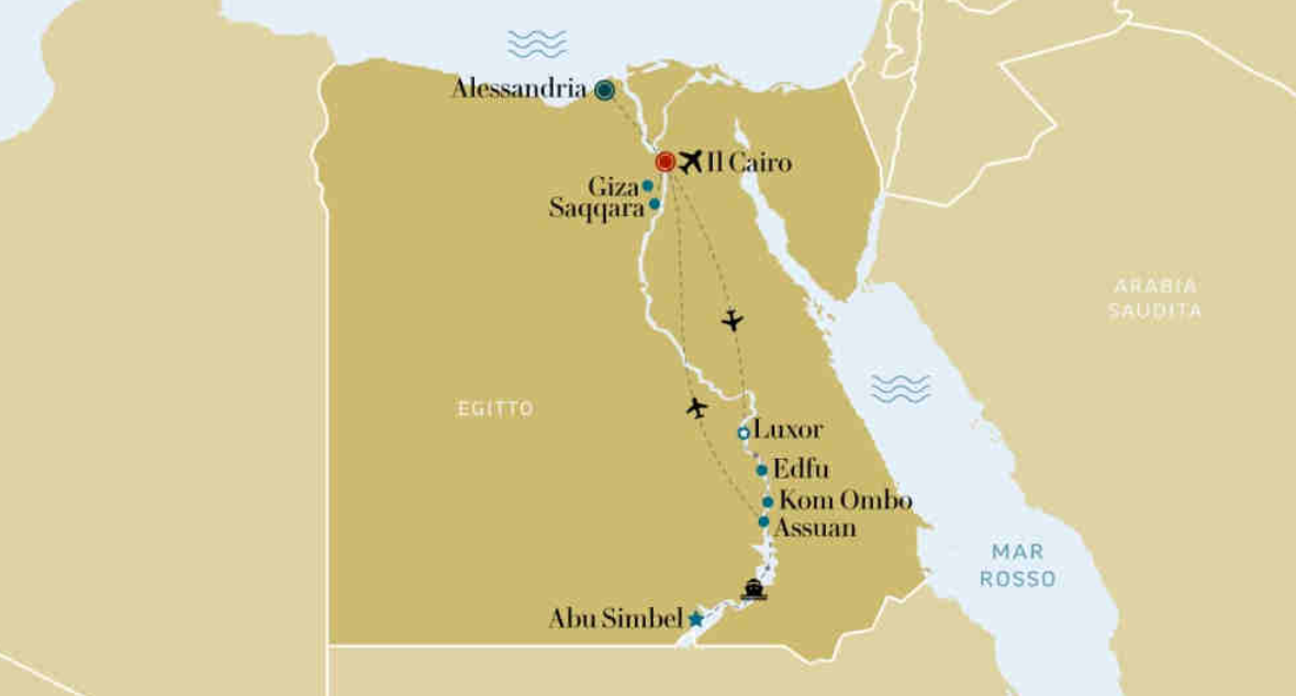 Un viaggio in Egitto che tocca tre luoghi fondamentali della civiltà Egizia: Il Cairo, con i tesori del Museo Egizio e le imponenti piramidi; la navigazione lungo il Nilo, con i meravigliosi templi, come quelli di Luxor e Assuan; infine Alessandria, dal glorioso passato e sede della più grande biblioteca del mondo antico.