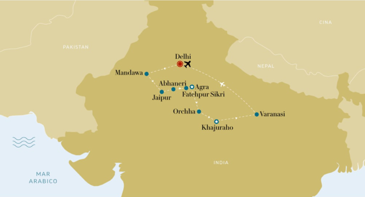 Delhi, Mandawa, Jaipur, Fatehpur Sikri, Agra, Varanasi.