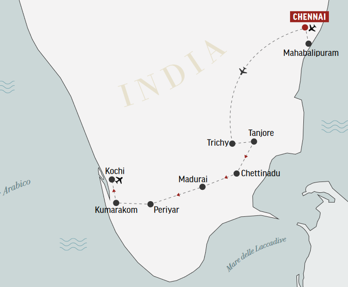 Partiamo dall’Italia su un volo di linea per Chennai, megalopoli brulicante di vita e capitale dello stato di Tamil Nadu. Un tempo nota come Madras, Chennai è il fulcro della civiltà dravidica, della quale preserva interessanti architetture ma anche le musiche e danze tipiche, l’arte e l’artigianato. Atterriamo in tarda serata o in nottata e, all’arrivo in aeroporto, incontriamo l’assistente che ci accompagna al nostro hotel.