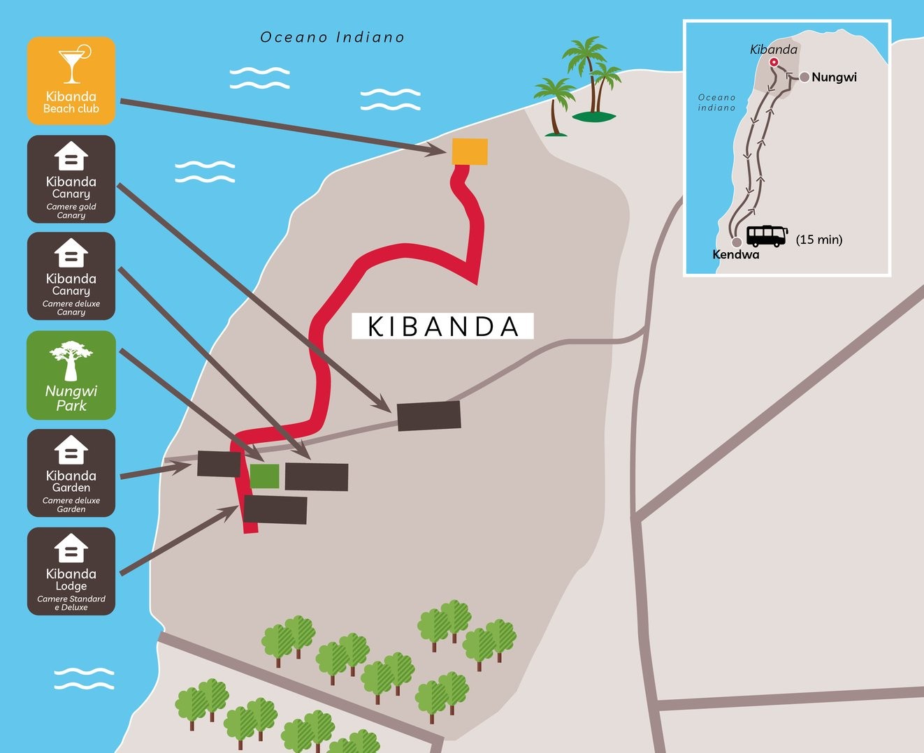 Una vera e propria chicca nel cuore di Nungwi, un simpatico complesso 4 stelle con attenta gestione italiana, da poco interamente rinnovato. Offre un’atmosfera frizzante e vivace nella cornice paradisiaca di Zanzibar. La spiaggia pubblica di Nungwi, icona della destinazione, dista solo 150 metri, ma la proprietà gestisce anche un suo beach club privato ed esclusivo collegato da navetta a disposizione degli ospiti a 900 metri. Il complesso offre un concept innovativo per l’isola, una sorta di albergo diffuso, con la sezione “Lodge” dove stanno i servizi principali, il bellissimo e attiguo “Nungwi Park”, il Kibanda Beach Club sul mare con servizio spiaggia e ristorazione, e infine la recentissima (2024) sezione Garden a 30 metri dal Nungwi Park e 50 dal Lodge. Cavallo di battaglia di Nungwi è il suo mare bellissimo. Qui il fenomeno delle maree è molto più contenuto, trovandoci sul versante rivolto verso il continente, e quindi è balneabile durante quasi tutta la giornata. Presso il Kibanda Beach Club si organizzano aperitivi con musica al tramonto tutti i giorni e DJ set con beach party dal primo pomeriggio a notte fonda tutti i sabati e tutte le domeniche. La filosofia dell’hotel consiste proprio nell’offrire agli ospiti un’esperienza coinvolgente di divertimento durante tutta la giornata, dalle prime luci del giorno, ai caldi colori del tramonto fino ai bagliori del notturno cielo stellato. I clienti con trattamento Tutto Incluso Soft (disponibile con supplemento), avranno anche possibilità di open bar analcolico al beach party fino alle 23, e quelli con trattamento di Tutto Incluso Hard open bar anche con alcolici. Il resort offre camere moderne e accoglienti dislocate tra la sezione Lodge e la bellissima sezione Garden. Quest’ultima vanta un rigoglioso giardino tropicale, molto intimo, e camere molto più spaziose con ampi terrazzi o verande. Il complesso offre anche una bella piscina e un nuovissimo “Kibanda Restaurant” affacciato sulla seducente e armoniosa piazza di Nungwi Park, divenuta il centro di attrazione più cool della località. Qui vi si trova anche il suggestivo bar dell’hotel, aperto agli esterni, dalle sembianze di un baobab, cuore pulsante della piazza, con le sue luci soffuse e uno staff coinvolgente che prepara aperitivi e cocktail di alta qualità. Grazie alla gestione italiana, è davvero notevole l’attenzione per la buona cucina, con abbinamenti di piatti italiani e locali in una proposta fusion davvero ottima. La posizione del complesso è strategica, a pochi passi dalle bellissime acque cristalline dell’amatissima Nungwi, ma contemporaneamente in pieno centro, a pochi minuti dai vari ristorantini, locali serali e negozi di artigianato locale che caratterizzano il luogo. La proprietà del lodge gestisce anche due centri diving con personale parlante italiano, frutto dell’esperienza maturata in quarant’anni di Mar Rosso e Maldive, e con i quali è possibile effettuare escursioni fantastiche come quelle all’Atollo di Mnemba e all’Isola di Tumbatu!