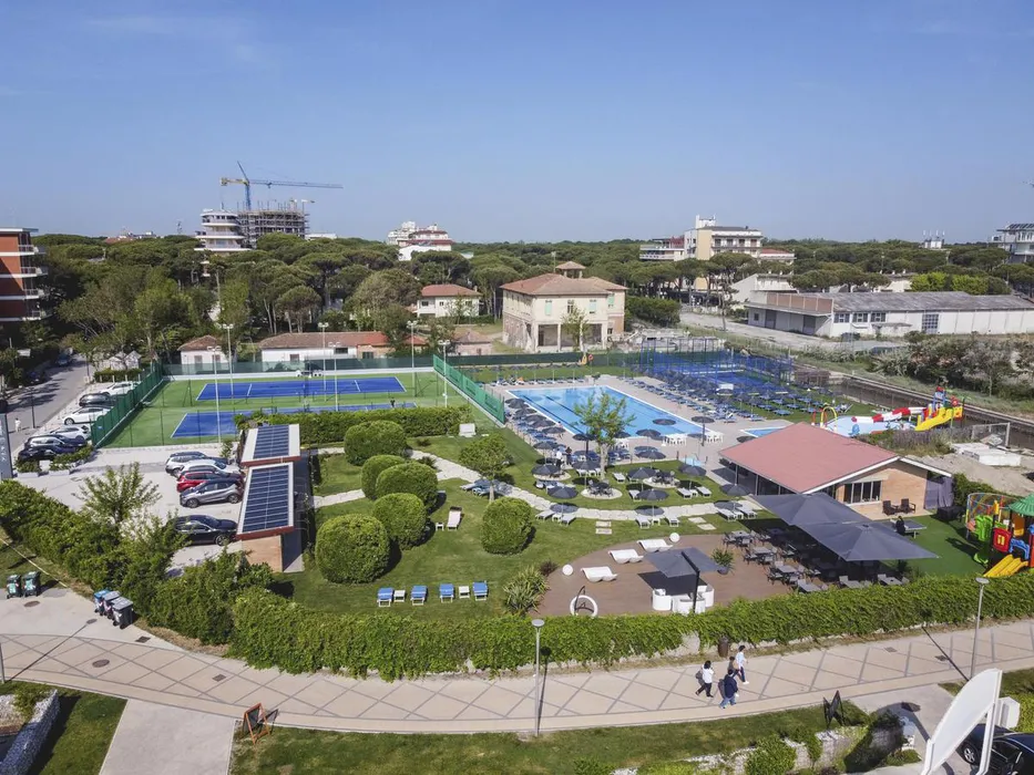 Giardino di oltre 6.000 mq con piscina semi olimpica e una per bambini, due campi da tennis, area benessere con cascata cervicale e idromassaggio, un ampio solarium con lettini, ombrelloni e servizio bar. Giochi d’acqua con scivolo per bambini.