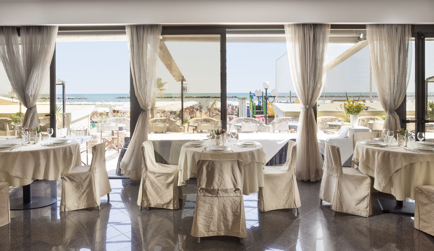 In un’ampia sala luminosa e climatizzata viene svolta la colazione e la cena con una cucina particolarmente curata e varia. Buffet a colazione; menu vario a scelta epiatti di pesce tutti i giorni con buffet di verdure, antipasti e dolci sia a pranzo che a cena.Il pasto del mezzogiorno viene svolto sull’ampia terrazza all’aperto, con vista direttamente sul mare.