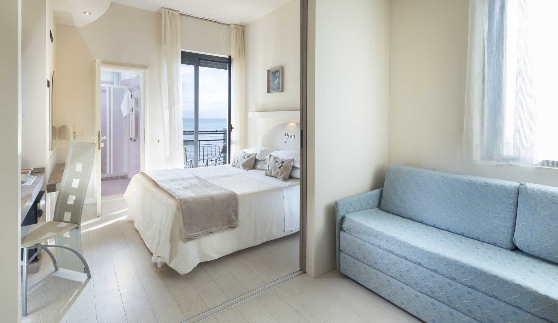 Tutte dotate di climatizzazione autonoma, servizi privati con doccia, specchio co-smetico, asciugacapelli, telefono, scrittoio, TV, piccolo frigo, cassaforte e balcone. Collega-mento veloce e gratuito a Internet tramite Wi-Fi. Le camere Standard hanno dai 2 ai 4 posti letto e non hanno la vista mare, le camere Classic hanno dai 2 ai 3 posti letto fronte mare o vista mare laterale, le camere Comfort hanno dai 2 ai 4 posti letto con vista mare. La singola ha il letto francese con vista mare laterale e/o senza vista mare.