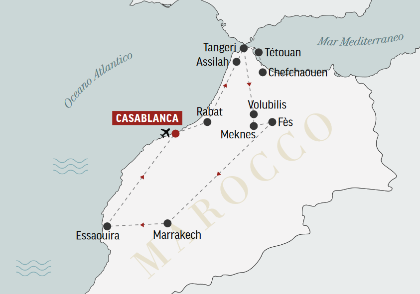 Alla scoperta di: Casablanca, Tangeri, Chefchaouen, Rabat, Meknés, Volubilis, Fés e Marrakech, Essaouira.