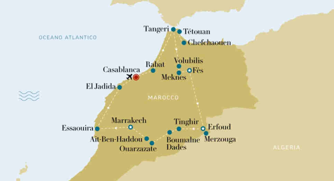 Alla scoperta di: Rabat, Chefchaouen, Tangeri, Fès, il deserto del Merzouga, Boumalne du Dadès, Marrakech, Essaouira.