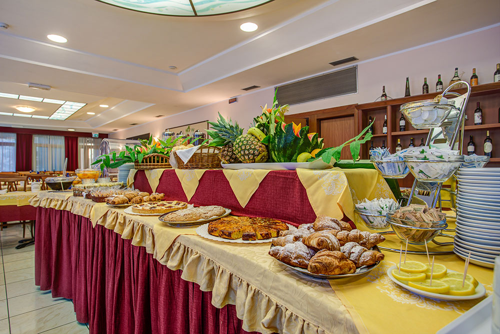 Climatizzato, recentemente rinnovato e reso ancor più accogliente in ogni suo dettaglio, offre la possibilità di gustare deliziose specialità romagnole, squisiti piatti tipici ed eccellenti ricette internazionali. Il menu dà la possibilità di scegliere fra quattro primi e quattro secondi di carne o pesce sia a pranzo sia a cena. A disposizione ricchi buffet di an-tipasti, contorni, verdure ed insalate. A colazione un fastoso buffet di prodotti dolci e salati. Ogni settimana serate di gala e romantiche cene a lume di candela.