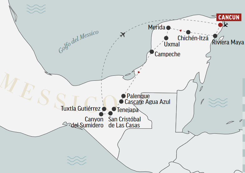 Partiamo dall’Italia su un volo di linea per Cancún, rinomata località di mare posta sulla Riviera Maya e affacciata sul Golfo del Messico. Atterriamo a Cancún e dall’aeroporto veniamo accompagnati al nostro hotel. La cena è libera.