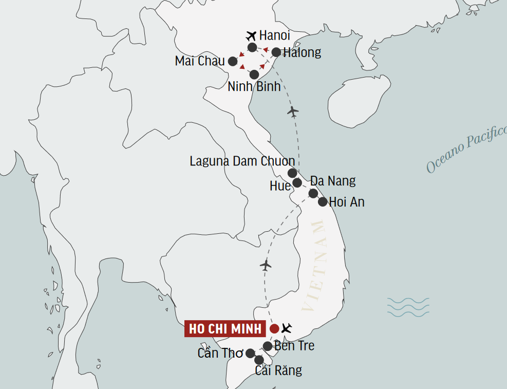 Alla scoperta di: Ho Chi Minh, Ben Tre, Can Tho, Hoi An, Thanh Dong, Hue, Dam Chuon, Hanoi, Mai Chau, Ninh Binh, Halong.